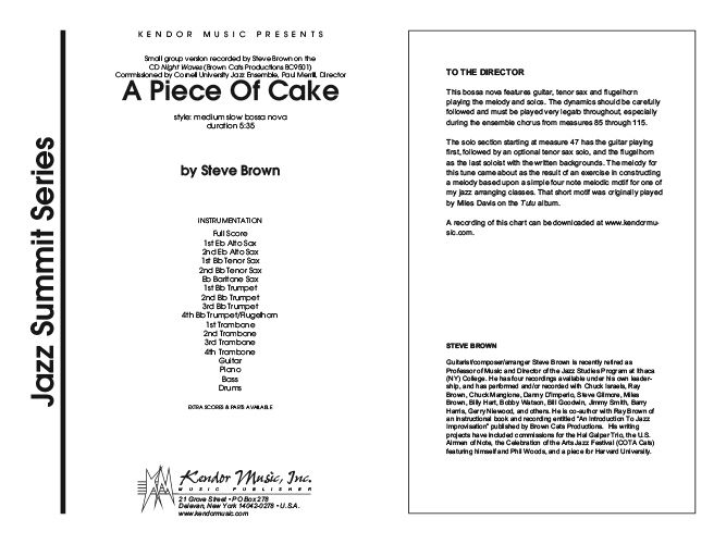 Paul Merrill, director of the Cornell University Jazz Ensemble (Ithaca, NY), commissioned this engaging bossa nova original for proficient groups. Don't let the title fool you, though, because there's an abundance of subtle, yet challenging material here requiring a mature approach from the ensemble. The melody is based on a simple four-note motif played by Miles Davis on his album Tutu. Brown later adapted this score for small-group and recorded it on his CD Night Waves (Brown Cats Productions/BC9501). Guitar, tenor sax, and flugelhorn are featured in melodic and solo roles. Duration 5:35