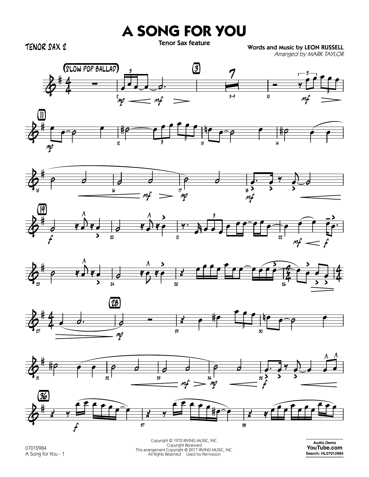 Composed in 1970, A Song For You has over the years become one of Leon Russell's most popular songs; recorded by countless artists including Peggy Lee, Michael Bublé, Ray Charles, Whitney Houston, Aretha Franklin and many others. Here is a standout version for jazz ensemble arranged as a solo feature for tenor sax.