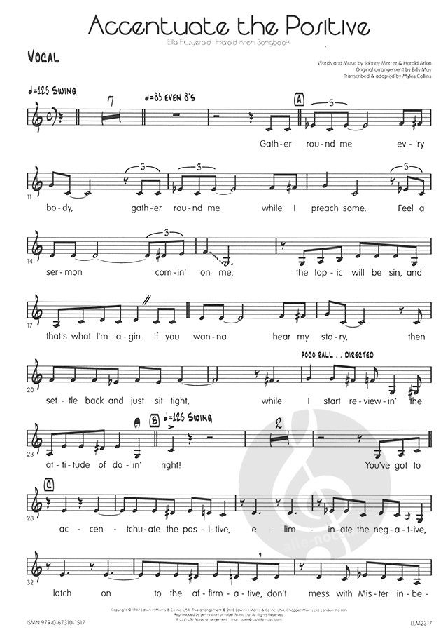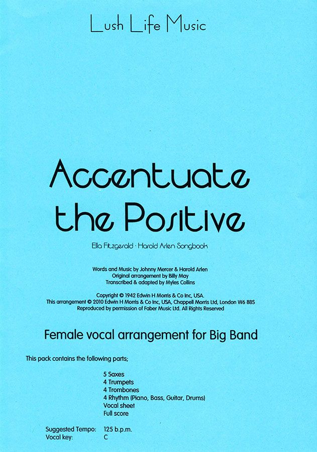 Diese atemberaubende Ella-Fitzgerald-Hitparade, die aus ihrem Harold-Arlen-Songbook-Album stammt, wurde ursprünglich von dem verstorbenen Billy May arrangiert und ist ein absoluter Klassiker. Wir haben die Saxophonlinien hinter der ersten Strophe vereinfacht, um die Instrumentendoppelungen zu entfernen, während wir den Geschmack des ursprünglichen Konzepts beibehalten haben, und wir haben eine kleine Änderung der Trompetenstimme im zweiten Takt des Charts vorgenommen. Abgesehen davon entspricht das Arrangement dem Original. Ellas Gesangslinie ist so ausgeschrieben, wie sie gesungen wird, aber es steht Ihrer Sängerin frei, sie in ihrem eigenen Stil zu interpretieren. Abgesehen von dem zweitaktigen Piano-Fill in der Strophe gibt es keine Soli, da es sich um eine reine Gesangseinlage handelt. Für den 16-taktigen Instrumentalteil in der Mitte des Stücks wird eine Altstimme benötigt, um die Klarinette zu verdoppeln, aber auch ein Sopran kann hier eingesetzt werden. Die Gesangstonart ist durchgängig C.