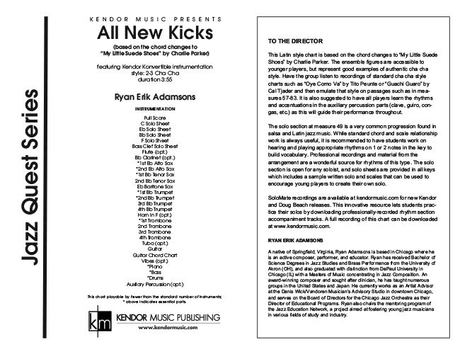 This cha cha for beginning groups is based on the chord changes to My Little Suede Shoes by Charlie Parker, and is a great chart to introduce the authentic Latin style! The solo section is written out with solo sheets provided in all keys along with scales to assist students in improvisation. Duration 3:55. Available in SmartMusic