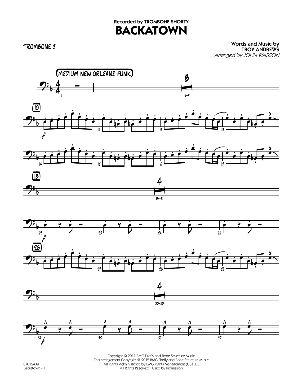 From Trombone Shorty's acclaimed CD Backatown, here is the hot title cut arranged for big band in a funky medium tempo. With a blend of catchy riffs, solid ensemble passages, and stop-time breaks, this chart exudes a spirited and unmistakable New Orleans swagger.