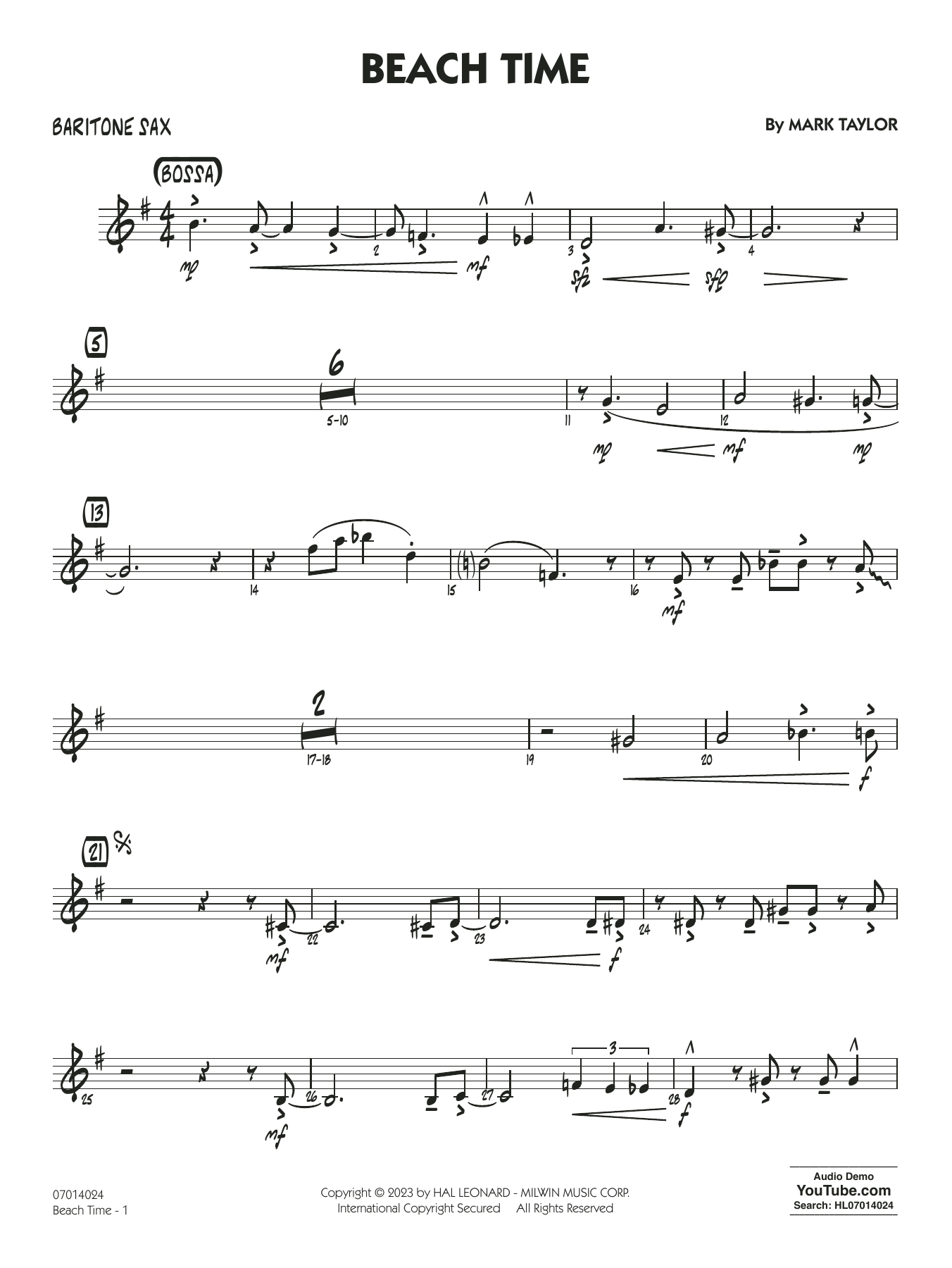 Mark Taylor hat dieses großartig klingende Original, das leicht zu lernen ist und Spaß macht, in einem moderaten Bossa-Stil geschrieben und für jüngere Spieler konzipiert. Alt-Saxophon und Trompete sind in einem Duett am Anfang und später mit geschriebenen oder ad lib.-Soli zu hören.