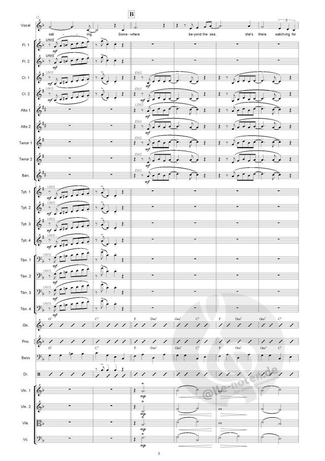 Instrumentation: 5 saxes (AATTB), 4 trumpets, 4 trombones, 4 rhythm, 2 flutes, 2 Bb clarinets, violins I and II, viola, cello, vocal and full score. The string parts at no higher than UK Ass, Board Grade V level.