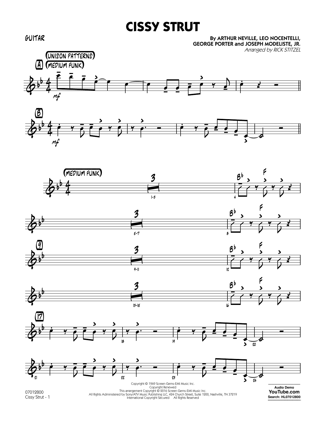 Originally recorded by The Meters in 1969, Cissy Strut has since become a model for playing funk, recorded by both jazz and rock artists. The signature bass line is played by trombones, tenors and baritone sax, and the entire band joins in with the catchy riffs. There are short solo breaks for the bass and drums, along with solo or soli spots for saxes and trumpets.