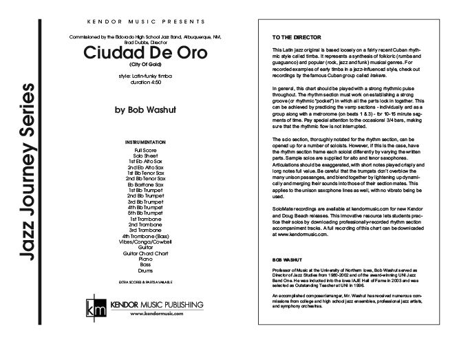 Subtitled City Of Gold, this Latin jazz original for advancing groups, based on a funky type of timba, will connect with audiences and makes an excellent addition to festival sets. Alto or tenor saxophone have the written or ad lib solo, and each set includes a guitar chord chart by Jim Greeson. Duration 4:50.