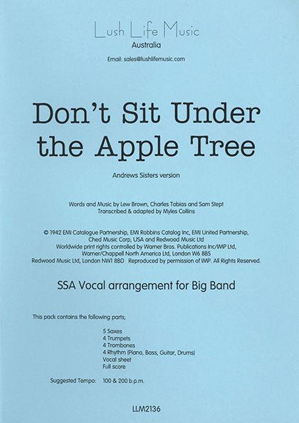 Don't Sit Under the Apple Tree war ein weiterer großer Hit der Andrews Sisters und verkaufte sich sehr gut, trotz des Erfolgs, den die Glenn Miller Band mit demselben Stück hatte. Der Chart beginnt mit einer Strophe in halbem Tempo und steigert sich zum ersten Refrain bis zum Ende des Stücks in schnellen Swing. Wir haben die originalen Gesangslinien so geschrieben, wie sie von den Andrews Sisters gesungen wurden, und die Band-Backings angepasst, um das Stück auf volle Big-Band-Sektionen zu bringen. Die Lead-Altstimme verdoppelt die Klarinette in der ersten Strophe, und es gibt keine anderen Saxophon-Doppelgänger. Die Tonart des Gesangs ist Es.