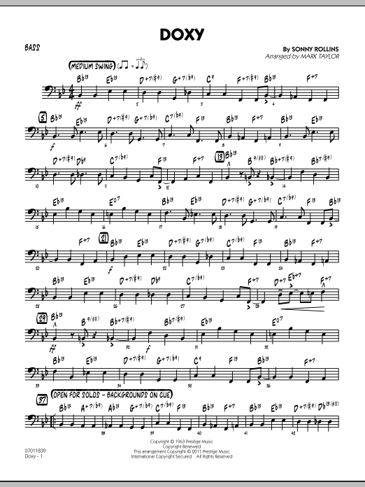 A jazz standard from the legendary Sonny Rollins, Doxy is arranged here in a very playable and appealing swing setting for little big band. Tenor sax, baritone sax and trombone take the lead in the beginning and an open solo section for any instrument adds to the chart's flexibility.
