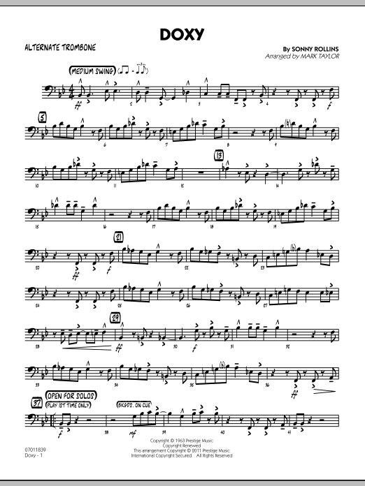 A jazz standard from the legendary Sonny Rollins, Doxy is arranged here in a very playable and appealing swing setting for little big band. Tenor sax, baritone sax and trombone take the lead in the beginning and an open solo section for any instrument adds to the chart's flexibility.