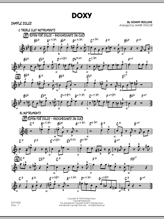 A jazz standard from the legendary Sonny Rollins, Doxy is arranged here in a very playable and appealing swing setting for little big band. Tenor sax, baritone sax and trombone take the lead in the beginning and an open solo section for any instrument adds to the chart's flexibility.