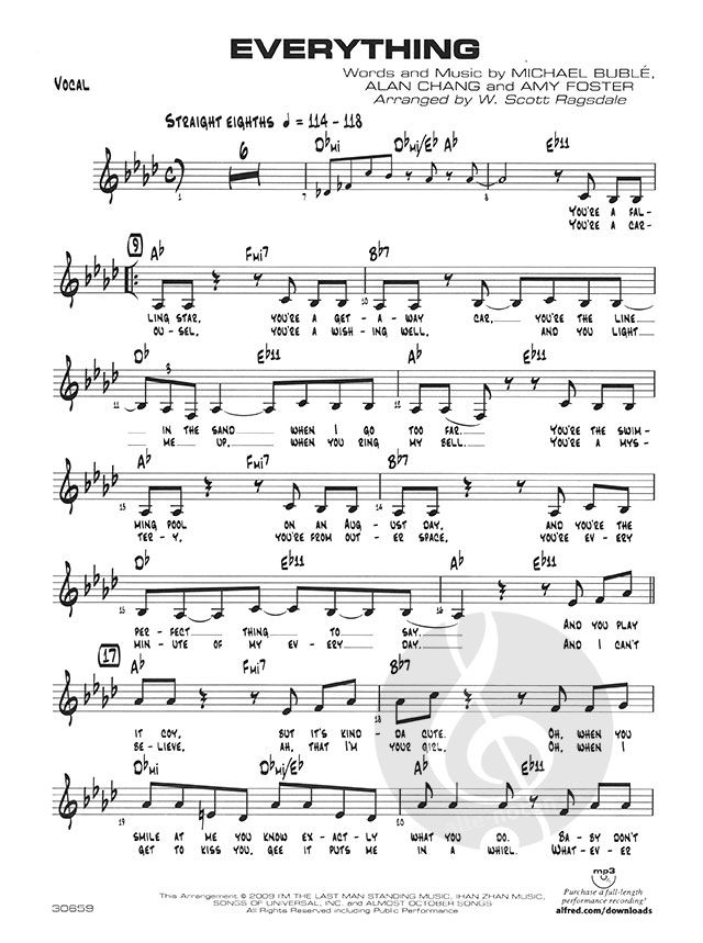 Michael Bublé sang this hit song and now it's time for your vocal soloist and jazz ensemble. Arranger Scott Ragsdale captured the essence of the Buble arrangement with his terrific adaptation of this great tune. Vocal range is from F below middle C up to third space C and the vocal part has some easy scat lines with vocal syllables. Lead trumpet range is to written A above the staff. A wonderful chart on a neat tune. (3:44)