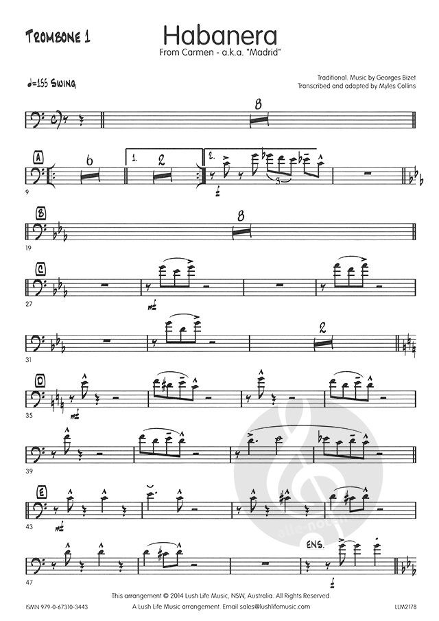 Dies ist die Habanera aus Bizets Carmen, transkribiert von der Nat King Cole / Quincy Jones Aufnahme. Das Stück ist ein rhythmischer Up-Tempo-Swinger, bei dem sowohl Ihr Sänger als auch Ihre Band auf ihre Kosten kommen. Die Originaltabelle ist in der Tonart C & Cm. Um jedoch die Stimm- und Instrumentalbereiche zu verringern, haben wir den Chart doppelseitig gedruckt, wobei die Rückseite in B & Bbm ist. Die oben angegebenen Tonumfänge beziehen sich auf die C/Cm-Version. Es gibt keine Saxophon-Doppelgänger.