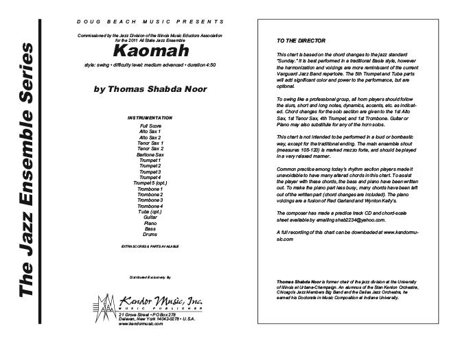 Commissioned by the Jazz Division of the Illinois Music Educator's Association, this Basie-style swing chart is based on the chord changes to the jazz standard Sunday. Rich voicings and solid swing figures combine to create outstanding ensemble work for the entire band. Though chord changes for the solo section are provided for alto, tenor, trumpet and trombone, guitar or piano may also substitute for any of the horn solos. Rhythm section parts are notated with chords cued. Duration 4:50. Available in SmartMusic.