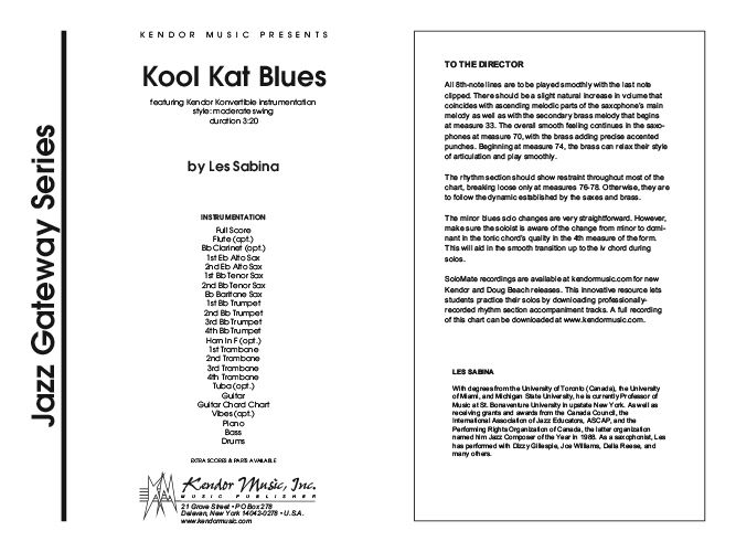 This moderate swing chart for developing groups features an easy 8th-note riff melody played by the saxophone section. The brass add reinforcement throughout and lead the ensemble during the shout chorus. The alto saxophone soloist is encouraged to improvise over the accessible minor blues progression, however a written solo is also provided. Featuring Kendor Konvertible scoring for 9-17 players, each set includes a guitar chord chart by Jim Greeson and optional flute, clarinet, F horn, tuba and vibes parts. Duration 3:20.