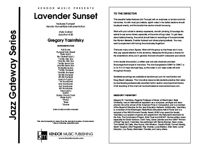 This beautiful ballad scored for developing groups features 2nd Trumpet with an emphasis on lyricism and rich harmonies. The double time solo section can be played as written or ad lib. Featuring Kendor Konvertible scoring for 9-17 players, each set includes a guitar chord chart by Jim Greeson and optional flute, clarinet, horn in f, tuba and vibes parts. Duration 4:30.