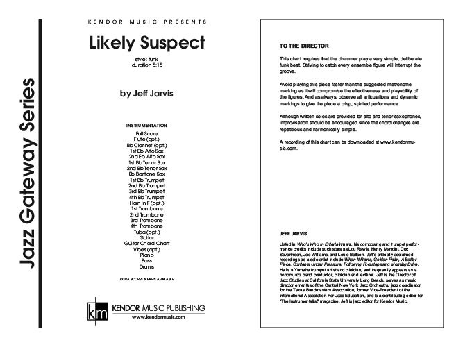 A driving funk groove coupled with a rich chord progression give this chart for developing groups plenty of audience appeal. Written or ad lib solo space is provided for alto and tenor sax. It's playable by 10-17 players, and each set includes a guitar chord chart by Jim Greeson. Duration 5:15.