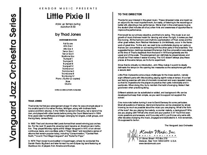 This classic chart is taken directly from the original ink parts that were on the stands at the Thad Jones-Mel Lewis Jazz Orchestra (now the Vanguard Jazz Orchestra) debut performance in February 1966 and continue to be played by the group Monday nights at the Village Vanguard in New York City. Originally commissioned by Count Basie for an entire album of Thad Jones' music, but Basie never made the record, and suggested that Thad start his own band instead. From that advice, Thad formed the Thad Jones-Mel Lewis Orchestra. Based on the chord changes to I Got Rhythm, this uptempo advanced level chart maintains the swinging Basie mindset and is in a 32-measure AABA form. Duration 8:50.