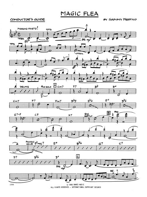 Recorded by Count Basie on his Basie-Straight Ahead album, the "Moocho Fasto!" style marking at the start of this fast swing outing for proficient players sums it up pretty well. Improvised solos for piano, tenor sax and drums are highlights, along with the solid ensemble scoring that we've all come to expect from the pen of Sammy Sammy Nestico. Rhythm section parts are partially notated with chords cued.