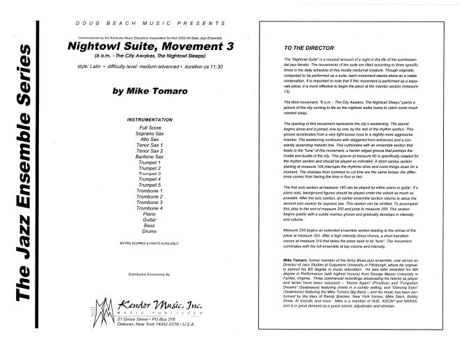 This challenging medium advanced Latin original hails from Mike Tomaro's extended work, Nightowl Suite, a musical account of a night in the life of the quintessential jazz fanatic. This movement finds our nocturnal fan going home as the city awakes for some much needed sleep after a night of listening to jazz. This movement can be played alone or programmed with the other two movements published separately. Duration ca 11:30.