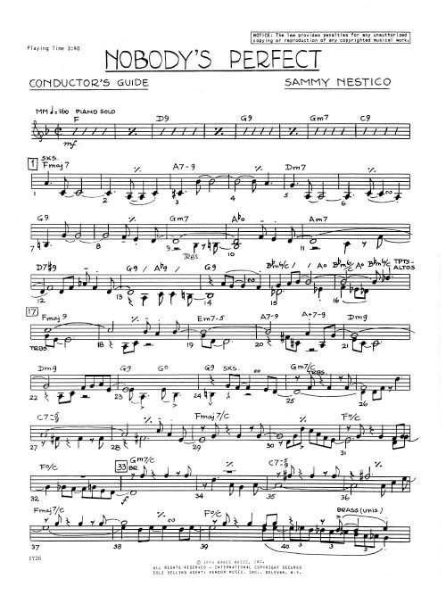 Originally issued in 1974, this chart penned for the Count Basie band has everything you'd expect from a Sammy Nestico classic -- solos for piano and tenor, sax and brass solis, a solid ensemble shout, and figures that practically play themselves. Top brass notes are D6 trumpet and A4 trombone. Duration 3:40.