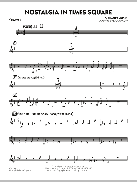 Originally written for the 1959 John Cassavetes film 'Shadows, ' Nostalgia in Times Square is a medium tempo blues but with a unique harmonic structure. Beautifully scored for younger ensembles by Sy Johnson, this chart includes a flexible solo section for any combination of alto, tenor, trumpet or trombone.