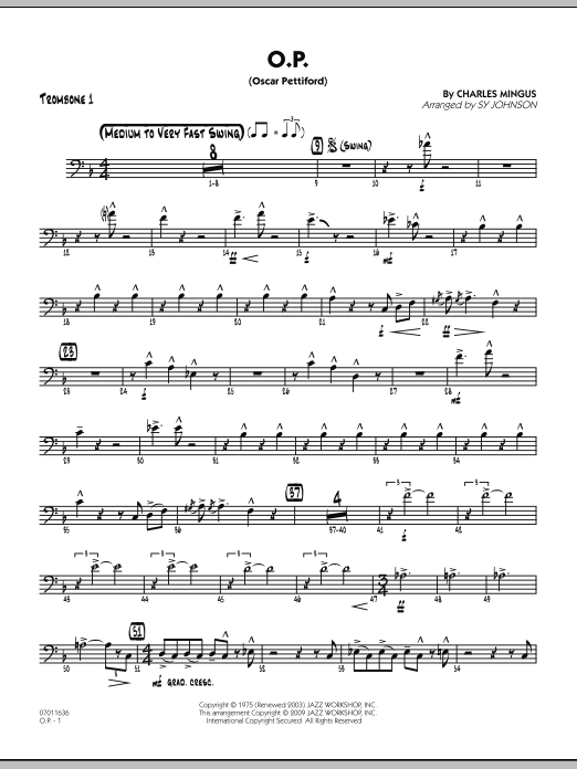 Titled in honor of Charles Mingus' good friend and mentor Oscar Pettiford, this swing chart opens with the two tenors, followed by all the saxes, and finally the entire ensemble. Whether you play this at a medium tempo or as a blazing burner, the result is the same - a unique-sounding chart that swings like crazy.