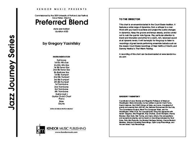 Commissioned by Dave Parker and the University of Portland Jazz Festival, this Count Basie style ballad features wide dynamic contrasts ranging from a whisper to a roar! It's an ideal piece for teaching your advancing ensemble how to lay down a steady groove while paying attention to balance, blend, and intonation. A guitar chord chart by Jim Greeson is included in each set. Duration 4:00.