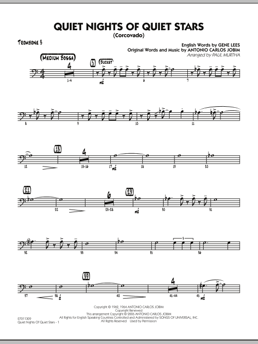 Although Jobim penned a wealth of great Latin tunes, this standard is unquestionably one of his best. Paul Murtha's smooth and silky chart alternates between the saxes and trumpets on the melody with solo space provided for alto sax. Although written with young players in mind, even advanced groups will sound great playing this exceptional arrangement.