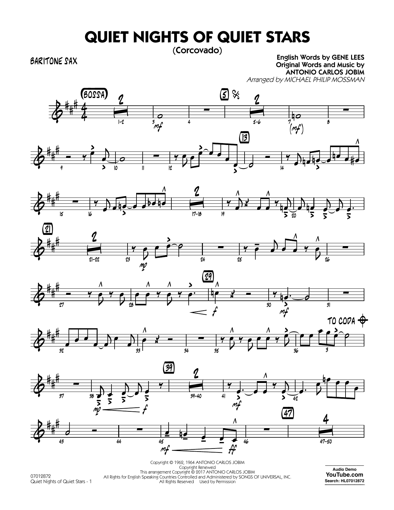 Antonio Carlos Jobims Latin-Klassiker 'Quiet Nights of Quiet Stars' wurde von fast allen Jazzgrößen wie Stan Getz, Astrud Gilberto, Miles Davis oder Frank Sinatra interpretiert und ist in dieser Version für Big Band und Gesang (Tenorsaxophon) eine willkommene Repertoire-Ergänzung.
