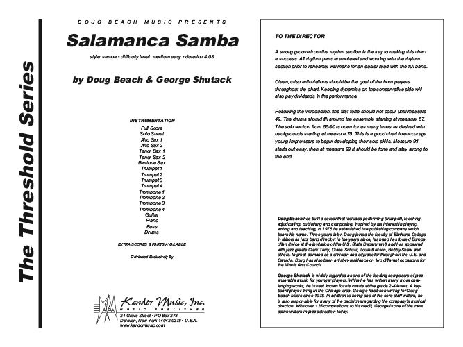 From the opening notes to the final chord, this Latin scorcher bristles with excitement. The combination of a strong melody, samba groove, and plenty of full ensemble work make it an ideal program opener or closer. Written lines for the open solo section are provided for all instruments, but improvisation should be encouraged. Rhythm section parts are notated with chords cued. Duration 4:03.