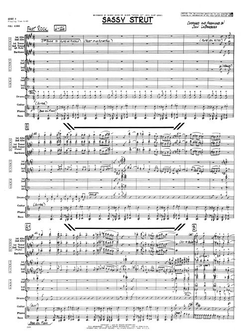Recorded by Buddy Rich on the album Stick It, this driving original with attitude assigns the primary solos to tenor and alto sax, with the drummer contributing several well-placed fills throughout. Lead trumpet will need solid high chops since a good share of that part hangs in or near the 6th octave range (top note G6). Duration 4:00.
