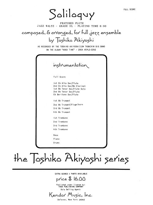 As recorded by the Toshiko Akiyoshi-Lew Tabackin Big Band on the album Road Time, this feature for solo flute includes solo room for alto sax and piano as well. By contrasting a series of transparent, combo-like passages with strong, full-ensemble sections, Akiyoshi generates the kind of intensity and excitement that makes a lasting impression on audiences. The solo flute part is written out exactly as it was played and recorded by Lew Tabackin. Duration 8:00.