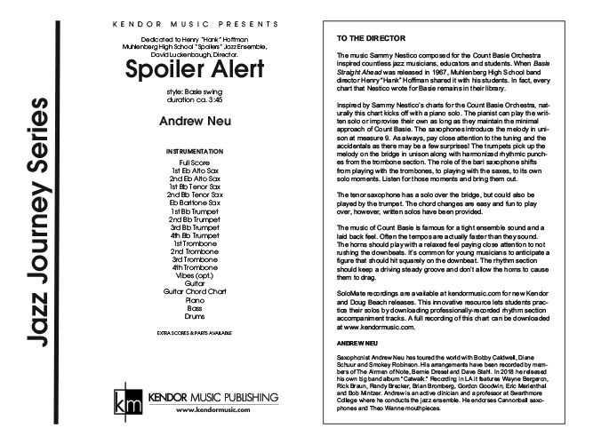 Inspired by the music Sammy Sammy Nestico wrote for Count Basie, this medium swing chart for advancing groups features the saxophones and trumpets in strong unison melodies. Naturally, it features written or ad lib solos for piano and tenor sax (or trumpet). Duration ca. 3:45