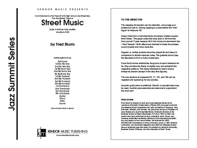 Commissioned by the Prescott (AZ) High School Jazz Ensemble directed by Dan Bradstreet, this Fred Sturm original is everything we've come to expect from this talented jazz composer. Set in a half-time funk shuffle style, the operative words here are rhythmic groove. The rhythm section parts are fully notated and the trumpet, tenor sax, trombone, and piano soloists will feel right at home playing over the 24-bar blues form. Duration 5:30.