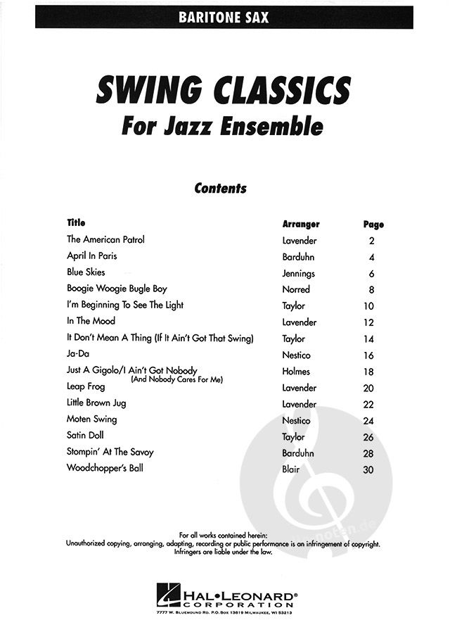 Includes: American Patrol, April in Paris, Blue Skies, Boogie Woogie Bugle Boy, I Ain't Got Nobody, I'm Beginning to See the Light, In the Mood, It Don't Mean a Thing (If It Ain't Got That Swing), Ja-Da, Just a Gigolo, Leap Frog, Little Brown Jug, Night Train, Satin Doll, Stompin' at the Savoy, Woodchopper's Ball.