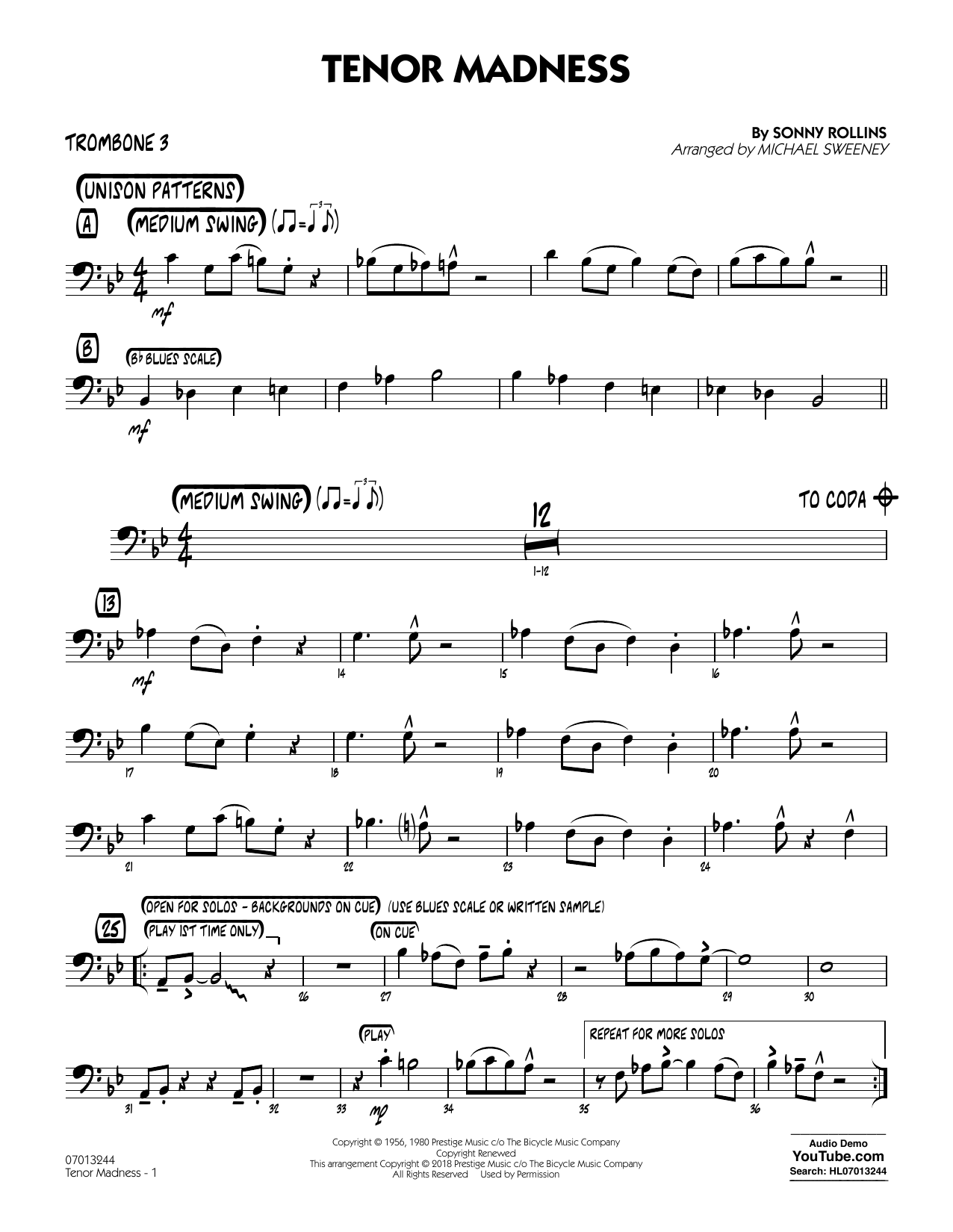 In this riff-based jazz standard, Michael Sweeney simplifies the figures just a touch to make it more playable by beginning groups, but authentic enough that it still really swings! A great introduction to Sonny Rollins, and with flexible solo opportunities using the blues scale.