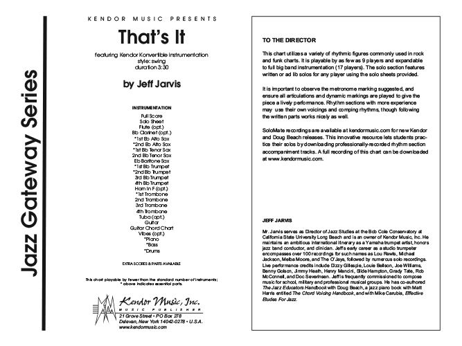 This swing original utilizes a variety of rhythmic figures commonly used in rock and funk charts and includes a nice stop-time section as well as interesting chord progressions throughout. The solo section features written or ad lib solos for any player using solo sheets provided.