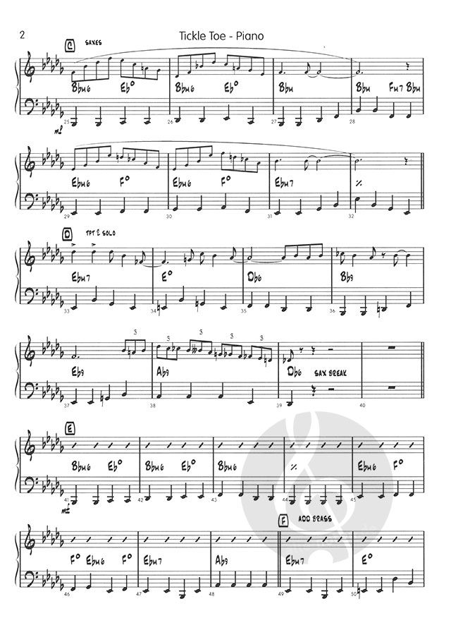 Tickle Toe ist ein echtes Tenorsaxofon-Feature. Kein Wunder, denn es wurde von Lester Young geschrieben! Dieses Stück mit der üblichen Basie-Kombination aus fließenden Saxophonlinien und druckvollen Blechbläsern ist in einer Molltonart geschrieben, was ihm eine eindringliche Tonalität verleiht. Mit 210 bpm ist das Stück zwar recht schnell, aber technisch nicht allzu anspruchsvoll, wenn Ihre Saxophonisten die Melodie erst einmal in den Griff bekommen haben. Wir haben alle Soli (Tenor, Trompete und Klavier) und auch die Akkorde ausgeschrieben, falls Ihre Spieler improvisieren wollen. Tickle Toe ist eine weitere sehr seltene Karte und gehört zu unserer wachsenden Serie von Basie-Charts, die unserer Meinung nach eine breitere Anerkennung verdienen. Es gibt keine Saxophon-Doubles, und die Bläser sind ziemlich moderat besetzt.