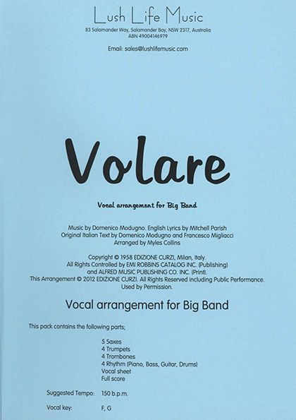Dies ist eine Up-Tempo, hart swingende weibliche Gesangsversion von Volare, und keine sanfte lateinische Wiedergabe. Der Chart wurde von einer Version der deutschen Sängerin und Schauspielerin Yvonne Catterfeld transkribiert und angepasst, und das Original kann auf YouTube gefunden werden. Nach einem großen Intro (mit optionalen 8va für die Trompeten - großartig, wenn sie den Tonumfang beherrschen) ist der erste Refrain komplett gesungen, leicht unterstützt von der Band. Dann folgt eine 16-taktige Bridge (die die Anfangsstrophe ist, wie sie im Original von Domenico Modungo geschrieben wurde), gefolgt vom zweiten Refrain, wobei die Bandunterstützung bis zur Modulation (eine ganze Stufe höher) an Intensität gewinnt. Ein letzter halber Refrain führt zu einem falschen Fade-out und einem großen Finale. Es gibt keine Saxophon-Doppelgänger, und das Bariton ist in tiefem A notiert. Die Gesangs-Tonarten sind F, das nach G moduliert.