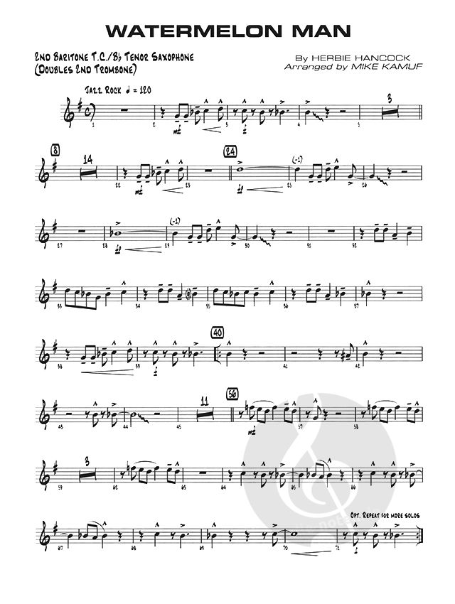 Oh yeah! This is the crowd pleaser and the band pleaser-a win-win. Fun, funky, hip, groovy-call it what you want, this chart is excellent in every way . If you have a decent bari player, he or she will really love this one. Some features are written-out solos for alto and tenor sax, a stop-time for the saxes, a fantastic interlude section, a monster shout chorus and some short drum fills. Optional parts are included, too! (4:43)
