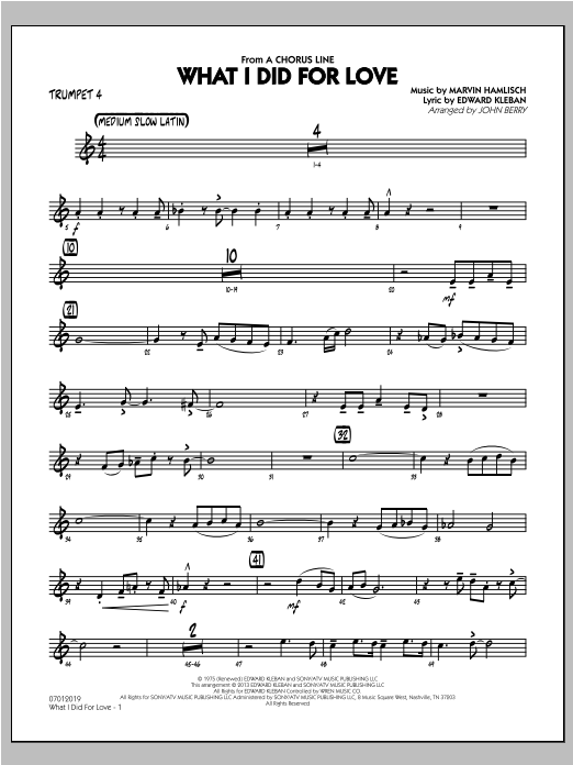 From Marvin Hamlisch's landmark musical A Chorus Line, here is the well-known ballad What I Did for Love in a creative and appealing setting for young bands. Written in a medium slow Latin style, it includes solos for trumpet and alto sax.