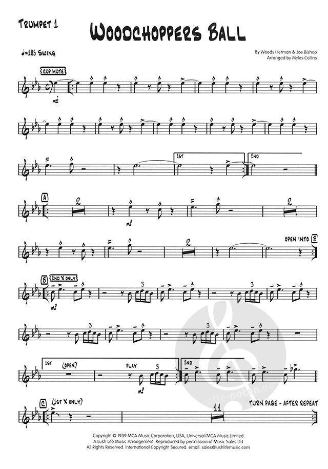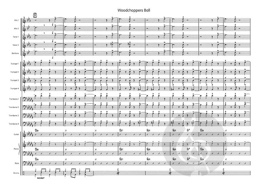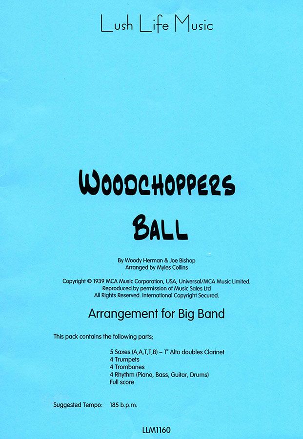 Hier ist der großartige Woodchoppers Ball. Dieses Stück wurde von Woody Herman mitgeschrieben und zum ersten Mal gespielt und wurde zu einem festen Bestandteil des Repertoires von Hermans Bands. Unsere Version basiert auf Woody's Version, wurde aber für die regulären Sektionen (Saxes AATTB, 8 Brass) umgeschrieben. Dieses Arrangement bietet Solopartien für Klarinette (auf der 1. Altstimme), Tenor, Trompete und Posaune und hat die charakteristische chromatische Reihe von Tonartwechseln am Ende, die dem ganzen Stück einen stürmischen Höhepunkt verleiht. Ein großartiges Swing-Chart.