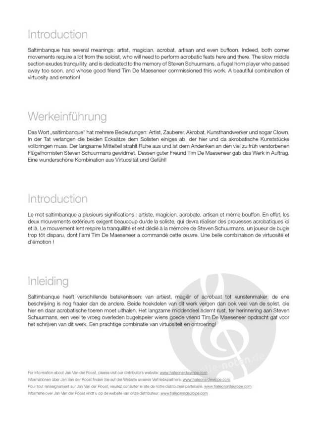Das Wort "saltimbanque" hat mehrere Bedeutungen: Artist, Zauberer, Akrobat, Kunsthandwerker und sogar Clown. In der Tat verlangen die beiden Ecksätze dem Solisten einiges ab, der hier und da akrobatische Kunststücke vollbringen muss. Der langsame Mittelteil strahlt Ruhe aus und ist dem Andenken an den viel zu früh verstorbenen Flügelhornisten Steven Schuurmans gewidmet. Dessen guter Freund Tim De Maeseneer gab das Werk in Auftrag. Eine wunderschöne Kombination aus Virtuosität und Gefühl!
