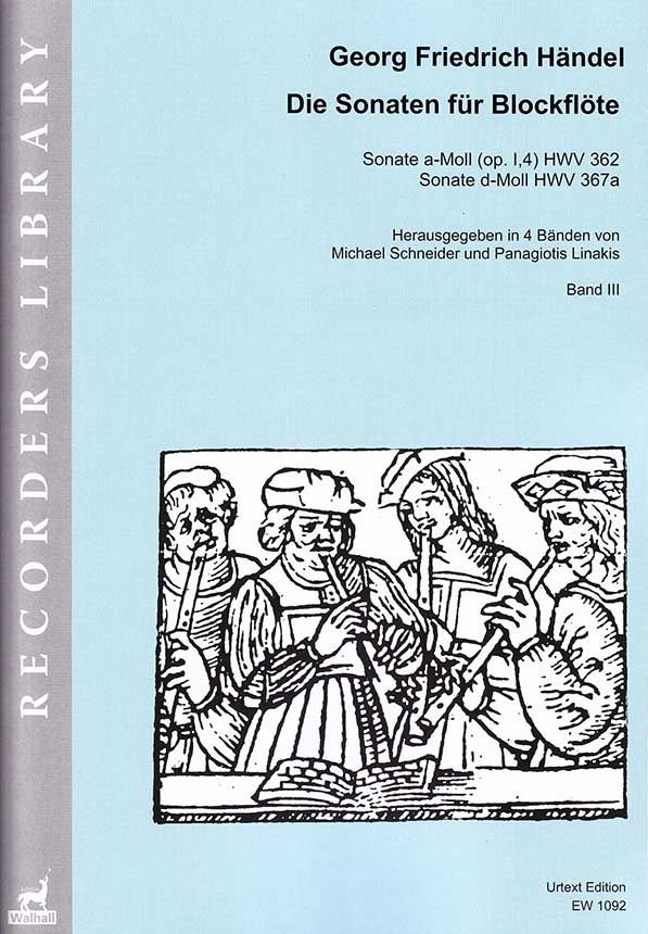 Gesamtausgabe in vier Bänden für Blockflöte & B. c, herausgegeben von Michael Schneider und Panagiotis Linakis. Der kunst- und fantasievoll ausgesetzte Generalbass von Linakis trägt aktuellen Erkenntnissen über die Kunst des Generalbass-Accompagnements zu Händels Zeit Rechnung. Gerade bei diesen Sonaten gehören die Vielfalt der durch den Bass angezeigten Strukturen und Verläufe und deren satztechnische Realisierung auf dem Tasteninstrument zur grundlegenden Idee der Kompositionen. Michael Schneider bietet zudem Verzierungsvorschläge für das Soloinstrument für ausgewählte Sätze. Reihe Recorders Library