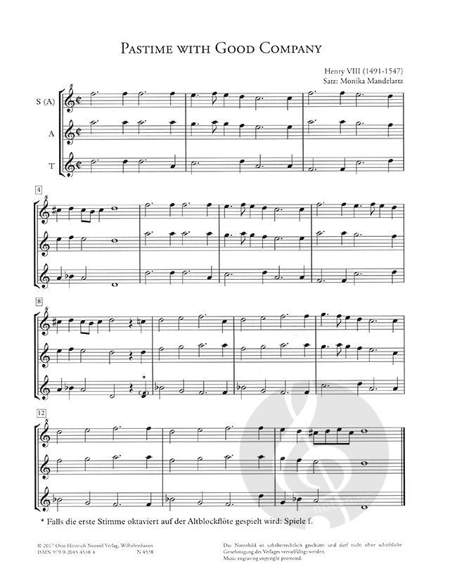 Alte Musik von den britischen Inseln übt eine besondere Faszination aus. Viele der Melodien aus dieser Musik, deren Quellen im 16. und 17. Jahrhundert liegen, hat Monika Mandelartz in Pastime with Good Company eingefangen und für Blockflötentrio arrangiert. Dabei steht nicht die historische Aufführungspraxis im Vordergrund, sondern die Freude am Musizieren: Arrangements, die Lust auf kreatives Musizieren machen.