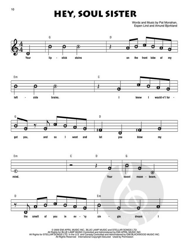 8 pop hits arranged for recorder in E-Z Play notation with the note name shown in the note head, including: Call Me Maybe / Hey, Soul Sister / Ho Hey / Home / I Knew You Were Trouble. / Paradise / Some Nights / What Makes You Beautiful.