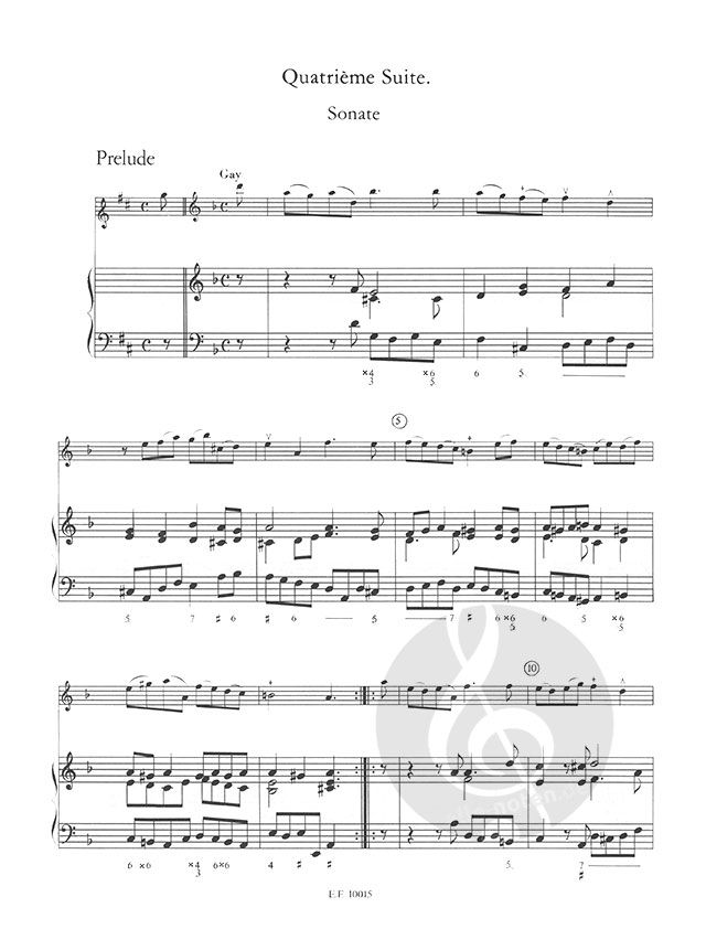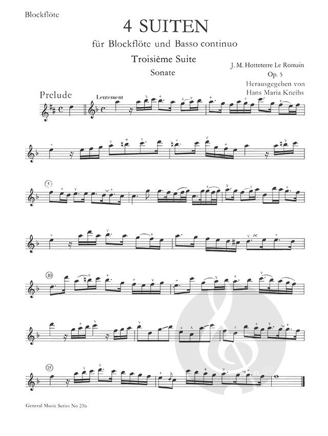 Die Ausgabe ist primär für den Blockflötenspieler gedacht; die Suiten sind daher, nach der Vorschrift des Autors, eine kleine Terz höher gelegt. Im übrigen folgt die Ausgabe getreu dem Erstdruck aus dem Jahre 1715. In der Realisierung der Bezifferung wurde die einfachste noch musikalisch sinnvoll erscheinende Lösung versucht. Das Vorwort und die Trillertabelle, die im Faksimile wiedergegeben sind, stammen aus Hotteterres Opus 2, dem 'Ersten Buch der Suiten', 1708. Sie sind im Druck des Opus 5 nicht enthalten, gelten aber selbstverständlich auch für das vorliegende Werk. Blockflötenspieler werden vielleicht anfänglich über die Tonarten der ersten beiden Suiten erschrecken: die Stücke lassen sich aber auf einem Instrument nach barokkem Typus ohne erhebliche Schwierigkeiten spielen (zum Troste: die Originaltonarten g-moll und c-moll liegen auf der alten Traversflöte keineswegs bequemer!). Für die verlangten Triller finden sich auf guten Blockflöten meist günstige Griffe: man zögere nicht, auf dem eigenen Instrument ein wenig zu experimentieren, um neue Kombinationen zu finden, falls die in den einschlägigen Tabellen angegebenen Griffe kein brauchbares Resultat ergeben. Die Hotteterre'sche Doppelzunge ('tu-ru') ist vor allem zur Darstellung der 'Inegalité' anzuwenden. Das 'r' ist meines Erachtens als 'Zungen-r' zu verstehen, mit einfachem Anstoß der Zungenspitze am Gaumen. Bezüglich 'Flattements' siehe den 'Traité de la Flute'. Die Baßstimme ist im Gegensatz zur Oberstimme nicht durchgehend mit Artikulationszeichen versehen; man wird sie meistens anzugleichen haben. Zur Vorlage diente ein Exemplar aus der Sammlung der Bibliotheque du Conservatoire Royal in Brüssel (Nr. 15.422); der Herausgeber dankt der Bibliotheksleitung herzlich für ihr Entgegenkommen.