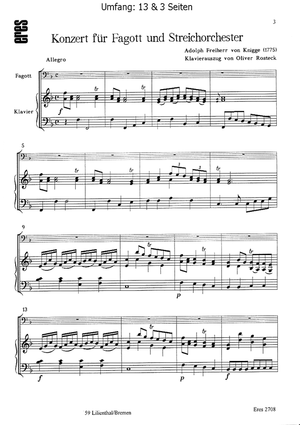 Fassung für Fagott mit Klavierbegleitung. Bearbeiter und Herausgeber: Oliver Rosteck.Knigge war fast 23 Jahre alt, als er 1775 sein Fagott-Konzert komponierte.