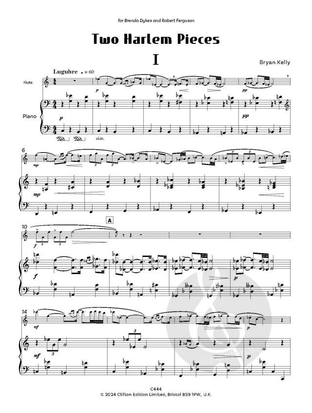 Zwei Harlem Pieces für Flöte und Klavier wurden von Brenda Dykes und Robert Ferguson bei Bryan Kelly in Auftrag gegeben.