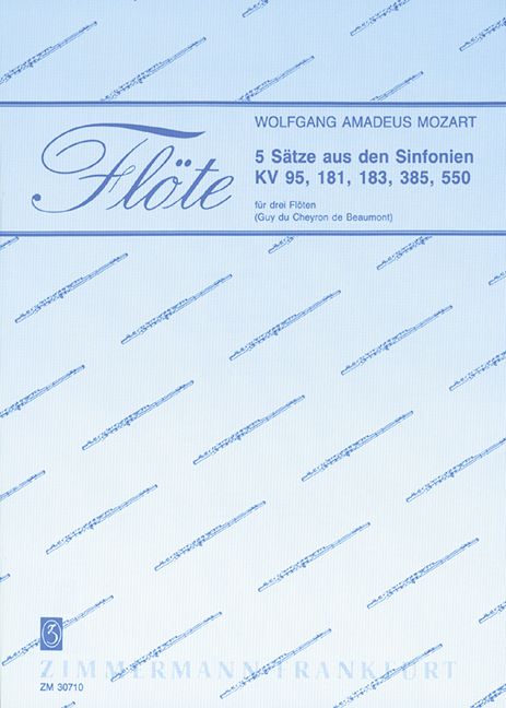Die Stücke sind progressv nach Schwierigkeitsgrad geordnet. Enthalten sind: Andante G-Dur aus KV 95, Andantino grazioso D-Dur aus KV 181, Menuetto g-Moll aus KV 183, Menuetto D-Dur aus KV 385 und das Menuetto g-Moll aus der Sinfonie KV 550. Wichtig war dem Bearbeiter, daß Flötisten die Gelegenheit erhalten, einmal Stücke zu spielen, die sie sonst nicht spielen können.