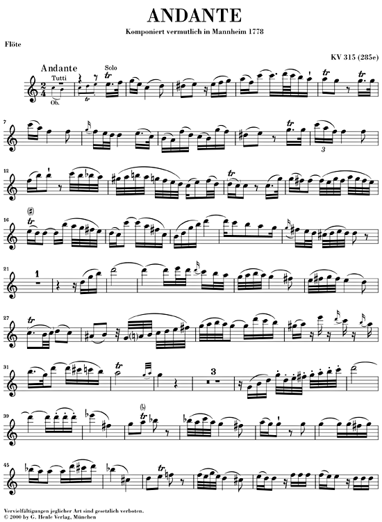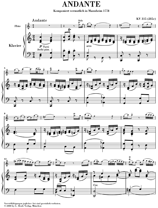 Das bekannte Flötenstück ist vermutlich ein alternativer langsamer Satz zu Mozarts Flötenkonzert G-dur. Das Andante ist als Klavierauszug heute nicht mehr aus dem Flötenunterricht und dem häuslichen Musizieren wegzudenken. Das liegt sicher an den wunderbar weit geschwungenen Kantilenen der Flötenstimme, die zudem - siehe den geringen Schwierigkeitsgrad (3) - schon von Schülern gut zu bewältigen sind.